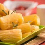 Porção de mandioca frita, crocante por fora e macia por dentro.