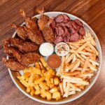 Porção tamanho família, composta por 12 unidades de camarão recheado com catupiry e empanado, batata frita, calabresa acebolada e mandioca frita.