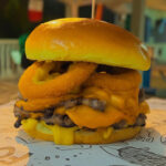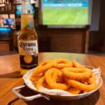 Porção com 300g de cebola empanada, sequinha e crocante por fora, e macia por dentro.