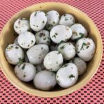 Porção com 15 unidades de ovinhos de codorna cozidos, temperado com lemon pepper e azeite.