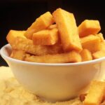 Porção de polenta frita, saborosa e temperada, crocante por fora e macia por dentro.